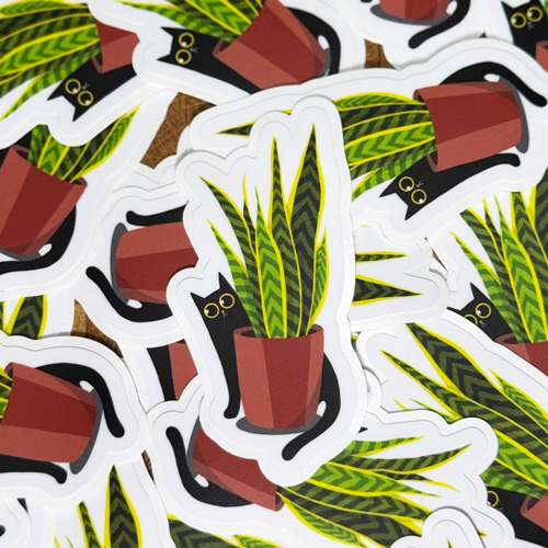 This design features a black cat keeping a watchful eye on a sturdy snake plant. Simple, charming, and calm with just a hint of curiosity, this matte sticker is a great addition for fans of plants, pets, and modern illustration.